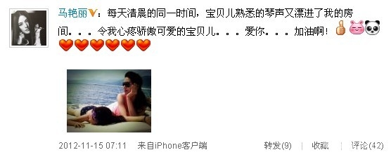 马艳丽在微博中写道:“每天清晨的同一时间,宝贝儿熟悉的琴声又漂进了我的房间。令我心疼骄傲可爱的宝贝儿。爱你。加油啊!”虽然对女儿很愧疚但母爱之情,溢于言表。艺人的女儿对于艺人来说,当然希望她能够继承自己的这份事业,从小的有意去培养她。一起出席活动、一起去见世面,能够享受很好的生活品质,但是同时也剥夺了孩子爱玩、爱跟伙伴一起玩的自由。
