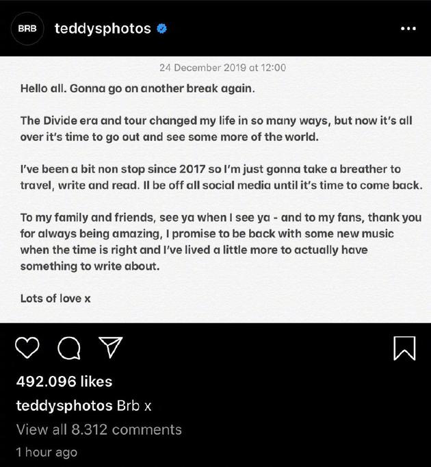明星网资讯 12月25日报道 12月24日,黄老板艾德·希兰(Ed Sheeran)在社交软件上正式发文表示将暂别乐坛,他称:“从2017年到现在,从未停歇。所以打算休息一段时间,去旅行、创作和阅读,同时也将离开社交网络,直到下次回归。”
