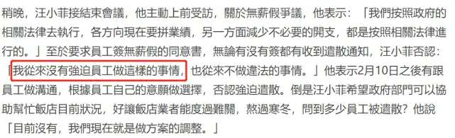 据悉,2月11日,汪小菲曾主动接受了记者的采访,关于无薪假期的协议,他称都是根据规定办事,一方面是要拼业绩,一方面也是为了减少不必要的开支。至于被问无论是否同意协议都被辞退一事,汪小菲否认表示:“我从来没没有强迫员工做这样的事。”