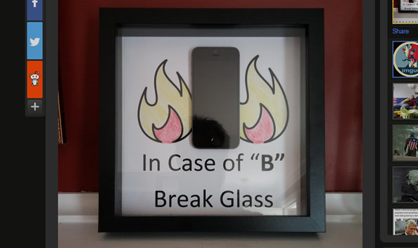 而且在画框里面画上两团熊熊烈火,同时写上下次拿到“B”就可以打破玻璃,重获iPhone,否则只有看看的份。