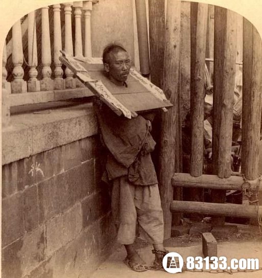 清代的斩立决、绞立决犯人由各府、厅、州、县审讯,有情节重大、罪不可赦罪名者,行刑时罪犯由监狱提出,讯明姓名、验明身首,当堂赏以酒、肉、饭食各一碗,届时一声炮响,刽子手举刀一挥,人头落地,取其首悬挂于市南门城墙 或三牌坊枭首示众。图为戴木枷的人,摄于1902年。