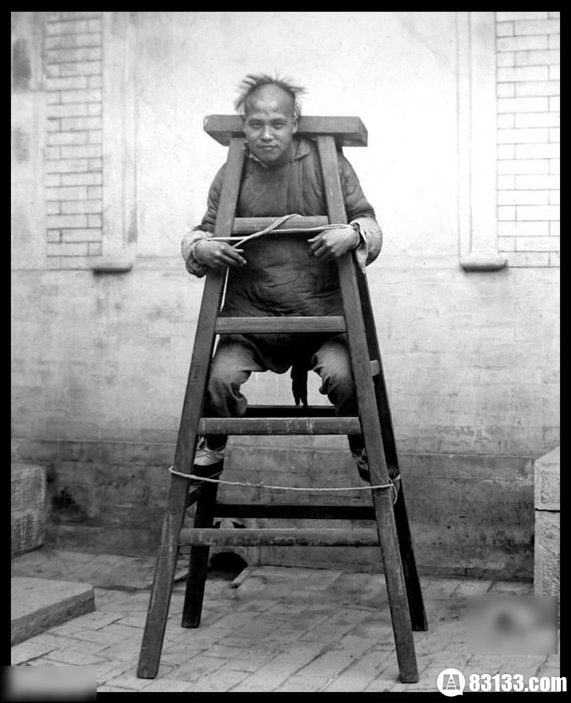 清代刑法本是依据明代刑罚而定的,但在严刑中废除了腰斩、廷杖两刑,表面上有所减轻,实际仍非常残酷。 照片上的那个人不是罪犯。他是在摄影者的指导下做示范。这种姿势不能站起来。 不能坐下。几天之后受刑者是什么样的状态也就可想而知了。