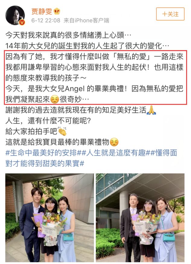 原来是这样,昨天贾静雯参加了大女儿的毕业典礼,同时在微博晒出几张梧桐妹的毕业典礼照片,感慨自己因为女儿而感受到「无私的爱」: