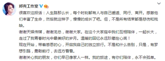 工作室微博原文:对于郑爽,天娱传媒龙丹妮曾这样评价:“郑爽是一个个性非常强但没太多欲望的孩子,因喜爱表演走进我们的视野,她成功在于不向社会低头,她有自己独立的世界,未来还需不断碰撞成长,也许会坎坷痛苦,但都是逐渐成熟的一个过程,或许她这个年龄阶段还无法领会很多事,但艺术的道路还很长。”