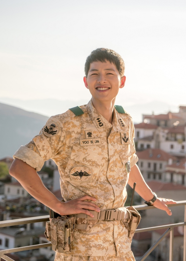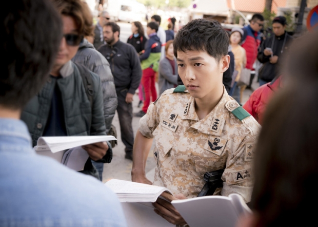 明星网资讯 韩国演员宋仲基拍摄电视剧《太阳的后裔》幕后花絮照曝光,比太阳还耀眼的魅力紧紧抓住现场工作人员的心。