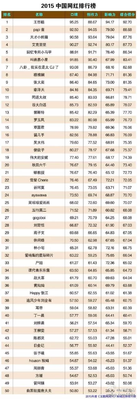 明星网资讯 日前,《互联网周刊》发布了2015年中国网红排行榜,它主要依据在社交媒体的口碑、创作力、影响力进行综合排名。最终统计结果显示,国民老公王思聪力压历任网红女友,排名第一。
