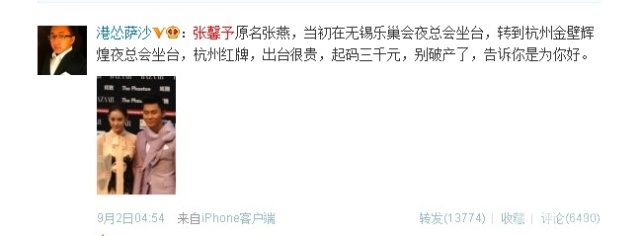 据悉,9月2日凌晨,一位名为“港怂萨沙”网友在网上发布一则信息,声称“张馨予原名张燕,当初在无锡乐巢会夜总会坐台,转到杭州金壁辉煌夜总会坐台,杭州红牌,出台很贵,起码三千元,别破产了,告诉你是为你好。”发布之后在被网友们迅速转发热议,转发高达万余次。据这位“港怂萨沙”网友的自我介绍,他的身份为中国基石资本基金创始人,国融汇金投资顾问公司董事长夏萨沙。