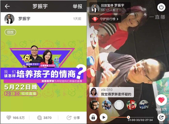 在直播中,罗胖一上来就给我们透露了他曾经在电视台工作中遇到的一些尴尬问题,因为直播间的灯光问题,我们的罗胖居然撅起屁股靠近手机屏幕给我们“一直播”的粉丝们来了一场亲密互动。“一直播”的粉丝们亲身直呼太幸福,简直不敢相信!接下来,我们的罗胖达人就邀请我们的儿童心理学博士张怡筠来探讨这次的话题“如何培养孩子的情商”。在“如何培养孩子的情商”中,张怡筠博士就给我们以举例子的方式引导父母们该如何读懂孩子的语言?如何将孩子的肢体语言变成自己的语言?在这短短的两个小时里,罗胖的直播房间就累计55.1万人观看,更是高达166.5万人的点赞量。“一直播”的粉丝们更是送出了“太阳花”“香水”“兰博基尼”等礼物持续霸屏!可见我们罗胖的人气之高!
