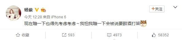 不过,报道出来后,杨紫在发布了微信写道:“现在蹦一下也得先考虑考虑~我怕我蹦一下会被说要醉酒打架”,回应酒醉事件。