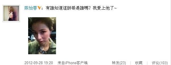 明星网讯 台湾女星陈怡蓉在台湾综艺节目《我猜我猜我猜猜猜》中的“寻找周杰伦MTV女主角”单位甄选活动中被发掘,从此踏入了演艺圈。2001年,她与许绍洋主演的电视剧《薰衣草》备受欢迎,陈怡蓉也因为这部电视剧被更多观众熟知,在《薰衣草》中她是一位多愁善感的女孩,但在现实生活中,她非常的活泼可爱。近日,她在微博上晒出自己的帅气造型,她将头发往后梳酷似短发,佩戴酷帅饰物,颇有点男儿英气。陈怡蓉在微博调侃:有谁知道这个帅哥是谁吗?我都快爱上他了!自恋的模样不免让人觉得好笑。
