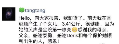 汤唯27日通过朋友圈报喜,“Hello,向大家报告,我卸货了。前天(25日)我在香港顺产生了个女儿,3.41公斤,很健康,因为她的哭声是全院第一嘹亮”。汤唯还写道:“感谢我的母亲、父亲,感谢泰勇,感谢Doris和每个保护她顺利出生的人,感恩!”