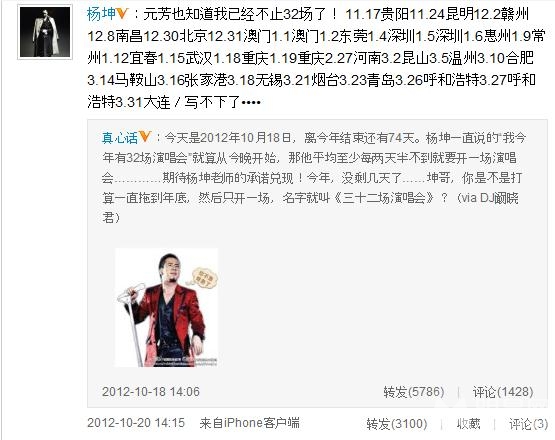 杨坤把32场演唱会挂在嘴边,但只说不练,让众人怀疑是为了博出位的宣传手段。网友“真心话”在微博上向杨坤发难:“今天是2012年10月18日,离今年结束还有74天。杨坤一直说的‘我今年有32场演唱会’就算从今晚开始,那他平均至少每两天半不到就要开一场演唱会……期待杨坤老师的承诺兑现!今年,没剩几天了……坤哥,你是不是打算一直拖到年底,然后只开一场,名字就叫《三十二场演唱会》。”