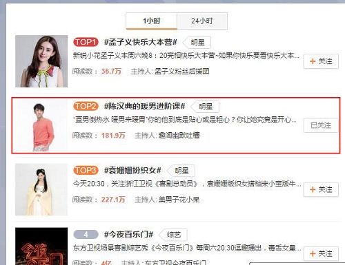 直播前期的微博话题#陈汉典的暖男进阶课#搜索参与量高达180万以上!达到实时热点排行榜第二!