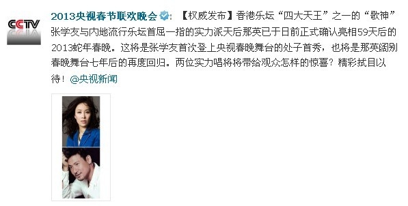 明星网 央视春晚上映在即,入选名单备受瞩目,目前cctv央视微博公开小道消息称2012年蛇年春晚这一年里,将会请到“四大天王”之一的张学友参加,并且还会邀请已离开春晚多年的那英与之同台,吸引了不少观众的眼球。