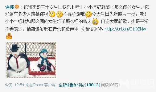 明星网讯 2012年12月20日,张杰迎来自己30岁的生日,为了纪念步入而立之年,张杰发行了首张翻唱大碟《那些和我们打过招呼的爱情》,专辑收录了十首单曲,表达了张杰内心的想法。今天中午老婆谢娜在微博上大送祝福给张杰,并自嘲自己太过闹腾,字里行间满满的都是表达对张杰的爱恋。