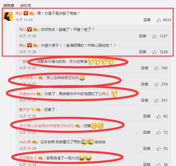 照片搞怪也就算了,娘娘还开始模仿高仿号给自己的照片评论,自己给自己加戏,说;“喂!你是不是多发了两张”,说完又给自己回复说确实是多发了两张,还说自己是大傻子缺心眼儿,一开始网友都以为是高仿号,一看是本尊后都哭笑不得,蒋欣冒充高仿号给自己加戏,也是厉害了。