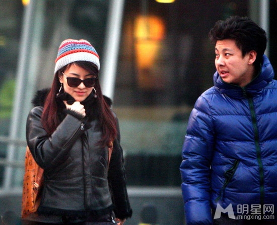 经纬戴着黑超,身穿黑色皮夹克外套+羽绒长体恤衫+黑色打+绿色平底休闲鞋+彩色毛线帽+mcm铆钉双肩背包,潮范儿十足。而男友打扮十分普通,蓝色连帽羽绒服是其全身最抢眼的颜色了。