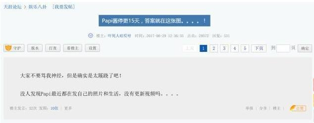 贴吧里,更是炸了锅,大家纷纷为papi盖楼,期待她早日回归。