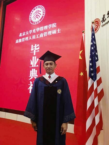 吴奇隆1日修完EMBA课程,微博网友PO出他穿蓝色毕业袍的照片,从教授手中接过“高级管理人员工商管理硕士”的毕业证书,脸上充满笑容。他除了和其他毕业生大合照,也开心高抛四方帽,毕业典礼结束后,他和其他同学一起在校园骑单车,吸引大批民众围观。