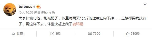 明星网资讯,7月6日下午,孙俪在微博发出一段文字,让网友劝邓超别减肥,称:“大家快劝劝他,别减肥了,体重每两天1公斤的速度在向下掉……走路都要我扶着了,再这样下去,体重快赶上我了”。