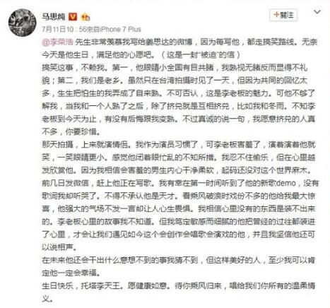 马思纯强调“这是一封“被迫”的信”,原来和李荣浩都是出身自安徽蚌埠市,实属同乡,虽然在台湾拍MV时只短短见面一天,却因为共同的记忆太多,两人迅速成了好友。她率直地说:“当我和一个人熟了以后,除了挤兑就是互相挤兑,比如我和冬雨,不知李老板到今天为止,有没有后悔跟我变熟”,不过最后强调:“我愿意挤兑的人真不多,你要珍惜。”