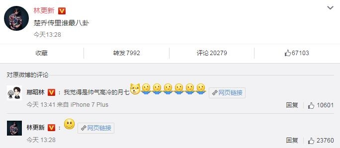 7月6日,林更新发了一条微博,让网友们直呼林更新的逗比气质又上线了。原来,他在微博发文称:“《楚乔传》里谁最八卦?”