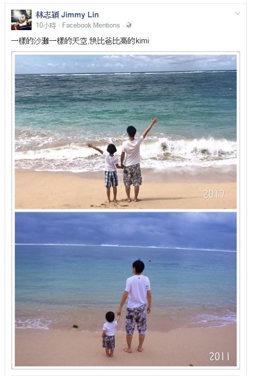 明星网资讯,据台湾媒体《东森新闻云》报道,艺人林志颖11日晒出带大儿子Kimi去看海的照片,对比6年前在同一个沙滩上拍合照,现在儿子已经高到自己的肩膀,忍不住说:“快比爸比高了。”而他的爱妻也PO照赞叹孩子长大了,“不需要妈咪小心翼翼牵手走路的Kimi”,夫妻有默契的留言令众人大感温馨。