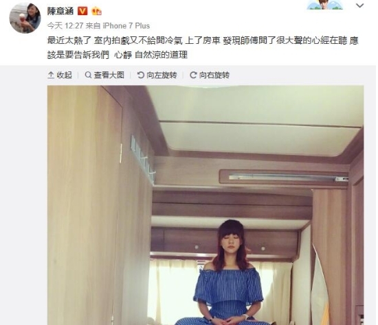 明星网资讯,7月13日中午,陈意涵发布微博称:“最近太热了,室内戏又不给开冷气,上了房车发现师傅开了很大声的《心经》在听,应该是要告诉我们心静自然凉的道理”。