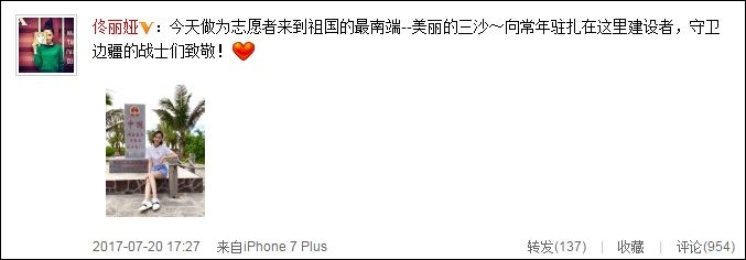 明星网资讯, 7月20日,佟丽娅在微博晒出自己在三沙群岛做志愿者的照片,并表达了对守卫边疆的战士的敬意:“今天作为志愿者来到祖国的最南端--美丽的三沙。向常年驻扎在这里的建设者,守卫边疆的战士们致敬!”照片中,佟丽娅身着白T和蓝色热裤,十分清爽,身后的石碑上刻着“中国领海基点方位点——赵述岛”的字样。据悉,此次佟丽娅作为志愿者去往三沙,为当地的战士送去了慰问。