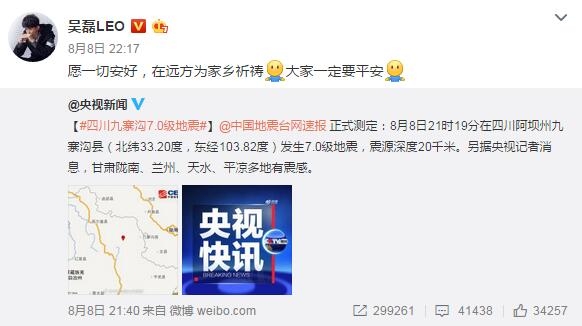 吴磊在微博发文说:“愿一切安好,在远方为家乡祈祷!大家一定要平安”网友们也纷纷留言为灾区祈福:“512还历历在目,希望一切安好”。