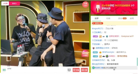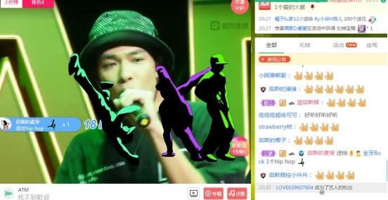 黑皮开场唱的《24K》把华语乐团男神级天王周杰伦和王力宏的经典名曲都融合进来,现场瞬间就被点燃,杨启斯的《斗篷》和8uck的《ATM》随后跟上,一连串嘻哈歌曲的暴击让粉丝疯狂刷屏“爱你”手势,礼物接连不断送上,“好酷”“帅”的粉丝告白停不下来。