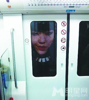 曝光的照片看来这个情节惊悚级别不差于恐怖片。照片中显示地铁门上赫然趴着吴莫愁的大头像,黑色的背景上吴莫愁画着鲜红的嘴唇,黑黑的眼线和眼影,鬼魅的表情,令人不经意间便会产生错觉,以为吴莫愁就趴在车门外。12日下午,沈阳地铁第一时间官方微博透露这是一个巧合,恰好地铁的停车节点就在大幅海报前,一般情况下是看不到的。