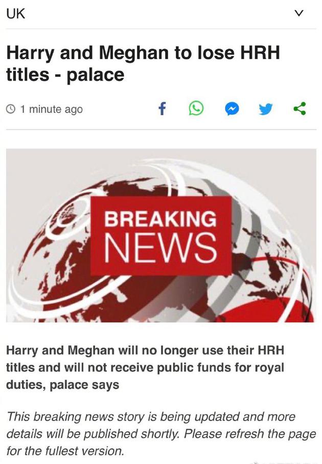 白金汉宫宣布:哈里梅根将放弃王室头衔