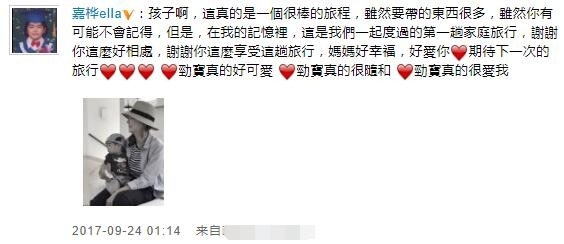 明星网资讯,9月24日凌晨,Ella(陈嘉桦)在微博晒出一家三口首次家庭旅行的照片,并配文:“孩子啊,这真的是一个很棒的旅程,虽然要带的东西很多,虽然你有可能不会记得,但是,在我的记忆里,这是我们一起度过的第一趟家庭旅行,谢谢你这么好相处,谢谢你这么享受这趟旅行,妈妈好幸福,好爱你?期待下一次的旅行???,劲宝真的好可爱,劲宝真的很随和,劲宝真的很爱我,劲宝真是好宝宝”。