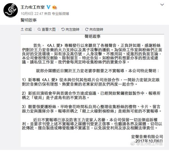 对此,在10月6日晚,王力宏工作室通过发博发表声明对这些谣言一一澄清,表示王力宏妻子李靓蕾很爱粉丝,不存在“亲上火线怼粉丝”的说法。