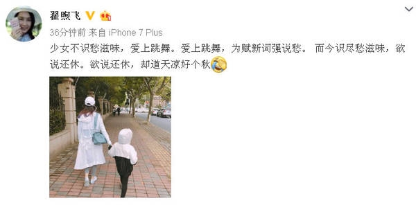 翟煦飞还很有才地改写了辛弃疾的词,既表明了天气转凉,又表示此番是带着女儿去学跳舞,整个词改得还颇为押韵,还有味道。