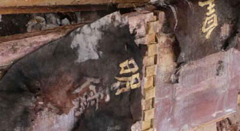 昨日下午4时许,南都记者在该墓地现场看到,该古墓位于一处青山下的土丘上,附近的青山已经被大面积挖去。墓穴被挖开后,约有五六十平方米大,被毁坏部分裸露在外,现场散落地陈列着一些石棺的石块和木棺的木板。裹在木棺上的红布上,用金粉写有“皇明儒”“张”、“老”等字样,红布被氧化后已经变成黑色。因部分被破坏,字迹不全。图中金粉书写字样清晰可见。