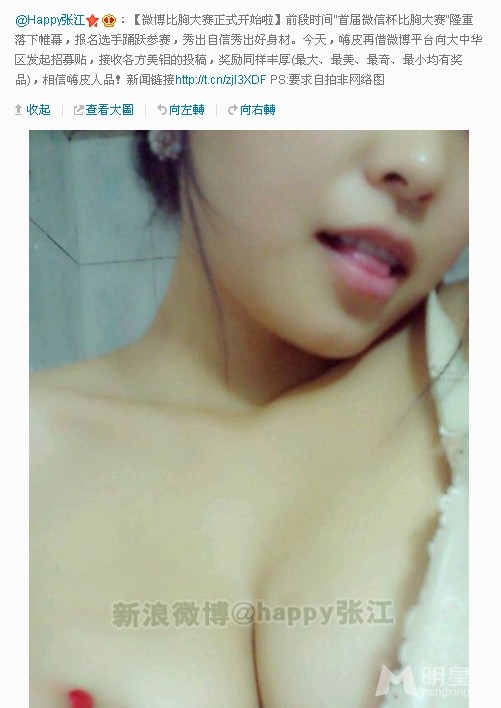 中国美胸大赛一波接一波,从最初的MOP到微信,再到微博平台,近日知名博主张江携手嗨皮、留一手在微博举办了中国微博比胸大赛,参赛者众多。短短几日已经收到了3000多名参赛选手,看中国微博美胸大赛组图精选集。