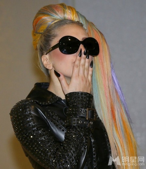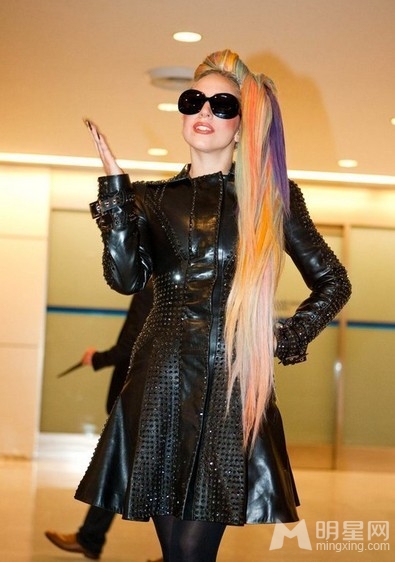 明星网资讯 5月8日,Lady Gaga亮相日本。顶着彩色瀑布秀发的Lady Gaga身穿铆钉皮衣,脚踩恨天高,就连眉毛都染成了绚丽的紫色,抢镜十足。现场,其面对前来欢迎的歌迷,频频献飞吻。