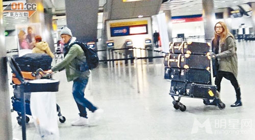 不过两人似乎快乐不知时日过,在机场柜位关闭15分钟前,才匆匆赶到办理登机手续。见身穿军绿色情侣外套的两人,各自推着载满4个大箱的行李车,其中2个箱更是同款不同色的情侣款,估计两人的行李重达最少超过150公斤。幸好阿乐豪气地为女友订了商务机票,否则如搭经济位,必定要付出多买两张机票的超重附加费,也可知阿乐玩得精明。先行的阿乐心痛纤瘦的Kary辛劳,途中帮手为女友推行李车。