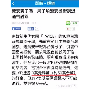 对于周子瑜被安徽卫视拒绝的新闻,台媒也有所报道,不过可能是心情太激动了,在挖苦黄安,替周子瑜鸣不平的同时,竟然把十万人民币写成了十万韩元,JYP这么大一个公司就为了区区550块人民币赖账?