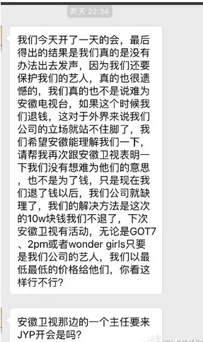 随后安微卫视强硬表态,"如果他们(JYP公司)继续执迷不悟,我们保留诉说的权利,保留在网上发声的权利,到那时,中国大陆估计就没有他们的立身之地了!全国任何一家电台,都不会和他们合作!不过不久后,安徽卫视揣宝把刚才那条微博删除,但今晚又发文告诉大家:之所以暂时删除是因为正在走法律程序。