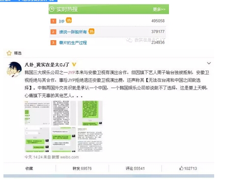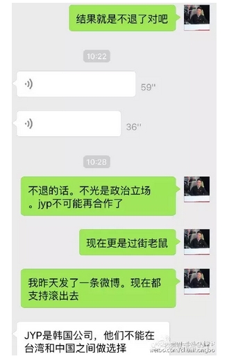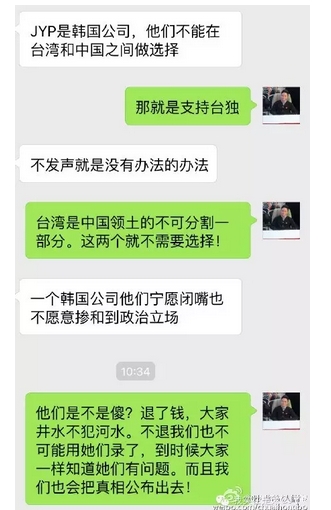 在安徽卫视方面爆出来的截图中,JYP方面的回应让人彻底无语:"JYP是韩国公司,不能在台湾和中国之间做选择。不发声是没有办法的办法。"而也就是这句话彻底惹怒了网友,JYP你也太没有底线了,台湾是中国领土不可分割的一部分,何来选择之说?中韩两国外交共识就是承认一个中国,一个韩国娱乐公司却说做不了选择,这是要上天啊。