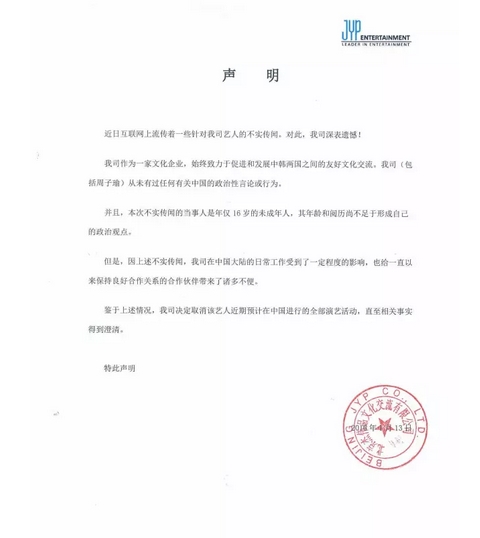 面对网友的声讨,今晚JYP公司发布声明说:周子瑜只是个孩子,她没有政治观点,网上都是不实传闻,而且宣布公司取消近期艺人在中国的活动。