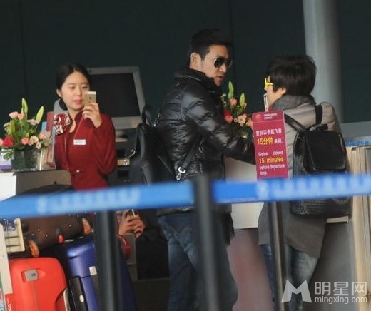在办理登机手续时,有工作人员拿着手机对着陆毅夫妇拍照,陆毅马上扭过头去和老婆窃窃私语,从表情上看似乎有点不太高兴。