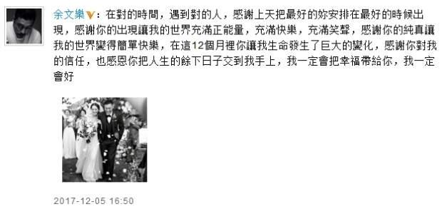 明星网资讯,12月5日,余文乐在社交网站晒出一张结婚照,宣布与王棠云的大婚喜讯。
