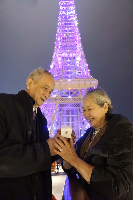 老爷爷特意挑选了浪漫的DR求婚钻戒,男士一生仅能定制一枚。希望给老奶奶最好的承诺:一生只爱你一人。用DR求婚钻戒My Heart系列表达“把心交给你”的约定,从此一心一意,一生一世。