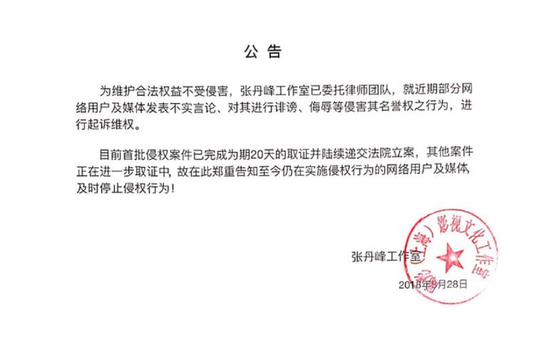 28日,张丹峰工作室在微博发表公告。公告称为维护合法权益不受侵害,张丹峰工作室已委托律师团队,就近期诽谤、侮辱等侵害其名誉权之行为进行起诉维权。并表示首批侵权案件已完成持续20天的取证工作,对于诽谤侵权行为,张丹峰工作室都将追究到底,绝不姑息。