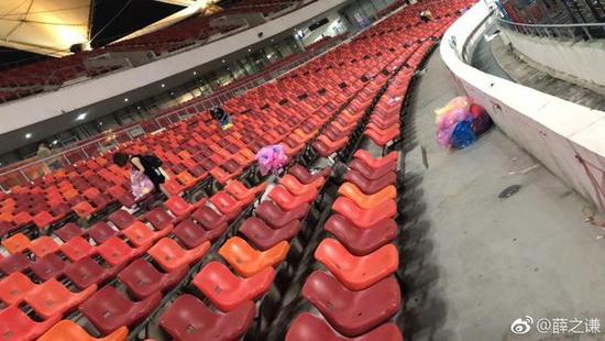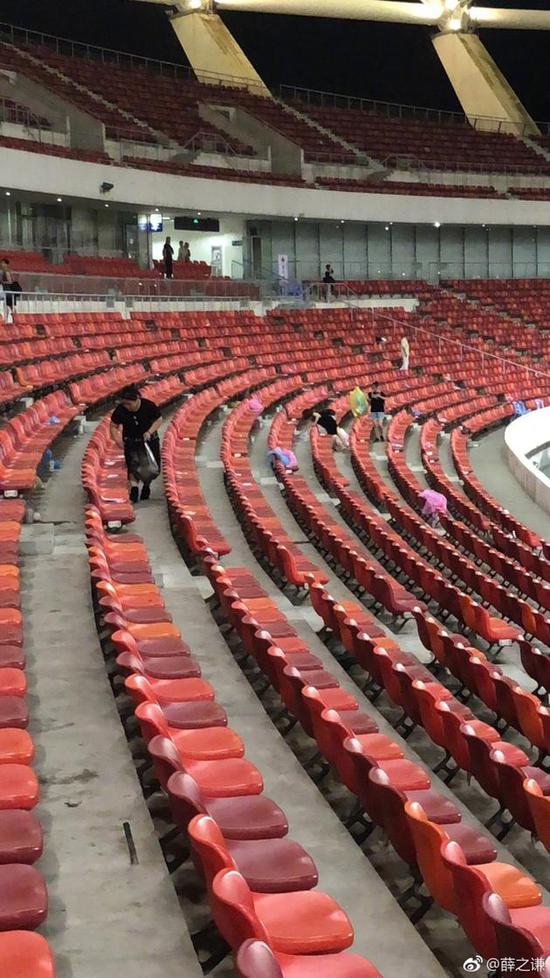 8月27日凌晨,薛之谦微博发文:“今天佛山站我演完,目送着大家陆续离场。一个小时后,还留下了三个谦友,他们清理了整个体育场一半的看台,我的工作人员去问来一句话‘我们只能清理到11点 要赶末班车回家 ’,我只剩一句话 无法让你们当面听见‘拥有你们 我很荣幸。’”照片是在体育馆看台捡拾垃圾的身影。