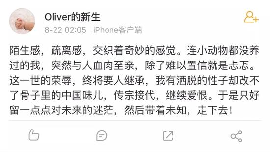 近日,微博上有网友扒出疑似于正的小号,该小号自曝在美国生子,言语之间充满初为人父的自豪与喜悦,还带着些许忐忑与迷茫。